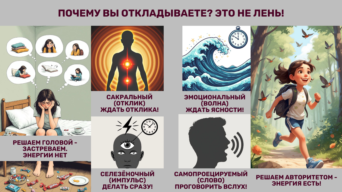 План был идеален: записаться к врачу, серьезно поговорить с партнером, обновить резюме или начать бегать по утрам. Все логично, нужно и важно. Наступает «час Х». Вы открываете глаза... и вместо дела уходите в глубокое пике по рилсам. Потом наводите марафет на кухне, потом вспоминаете про корм для кота. Вечером вы обнаруживаете, что важное дело так и висит мертвым грузом, а в голове крутится противная мысль: «Да что же со мной не так?» 👀 НО на самом деле 👉 с вами всё так. Дело не в волшебном пенделе или супер-планере. 🧠 Что на самом деле говорит наука Психолог Тимоти Пичел (а он изучал прокрастинацию 20 лет!) выяснил одну штуку: это не лень и не навыки тайм-менеджмента. Это попытка мозга избежать эмоционального дискомфорта. Мы буксуем не потому что не хотим, а потому что решение было принято как-то не так, через силу. И тут на сцену выходит Дизайн Человека с очень точным наблюдением 👇 У каждого из нас есть внутренний компас — Внутренний Авторитет. Это не про логику («так надо»),