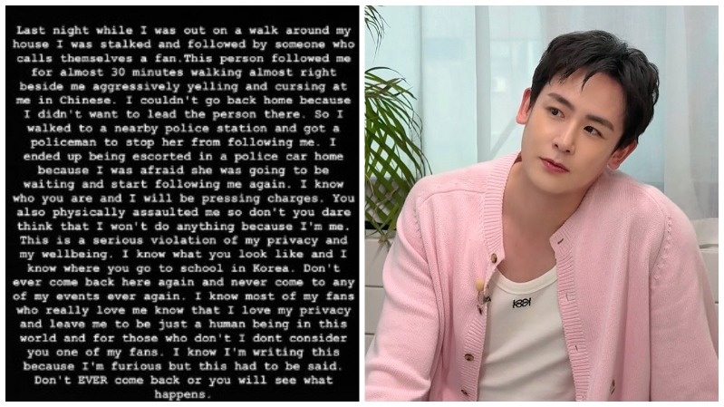 В сториз своей соцсети он рассказал следующее: "Прошлой ночью, когда я прогуливался около своего дома, за мной следил человек, называющий себя фанатом. Этот человек следовал за мной почти 30 минут, она шла почти вплотную, агрессивно кричала и проклинала меня по-китайски. Я не мог вернуться домой, потому что не хотел показать этому человеку путь туда. Поэтому я пошел в ближайший полицейский участок и попросил полицейского остановить ее, чтобы она не преследовала меня. В итоге меня отвезли домой на полицейской машине, потому что я боялся, что она будет ждать и снова начнет преследование. Я знаю кто вы, и я буду выдвигать обвинения. Вы также подвергаете меня физическому насилию, так что не смейте думать, что я ничего не сделаю, потому что я - это я. Это серьезное нарушение моей конфиденциальности и моего благополучия. Я знаю, как вы выглядите, и знаю, в какую школу вы ходите в Корее. Никогда больше не возвращайтесь сюда и не приходите ни на одно из моих мероприятий. Я знаю, что большинств