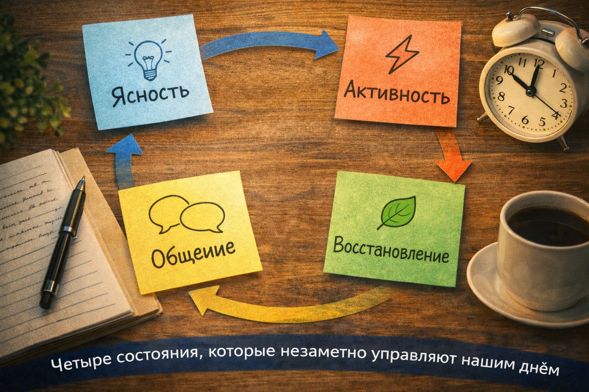 Я продолжаю наблюдать одну простую вещь. Не время. А состояния, которые приходят и уходят в течение дня. Пока наблюдения складываются в неожиданную картину. Похоже, что в течение суток у человека периодически появляются четыре разных режима. Я называю их просто — состояния дня. 1. Состояние ясности Это моменты, когда мысли собираются. Легче всего: — анализировать
