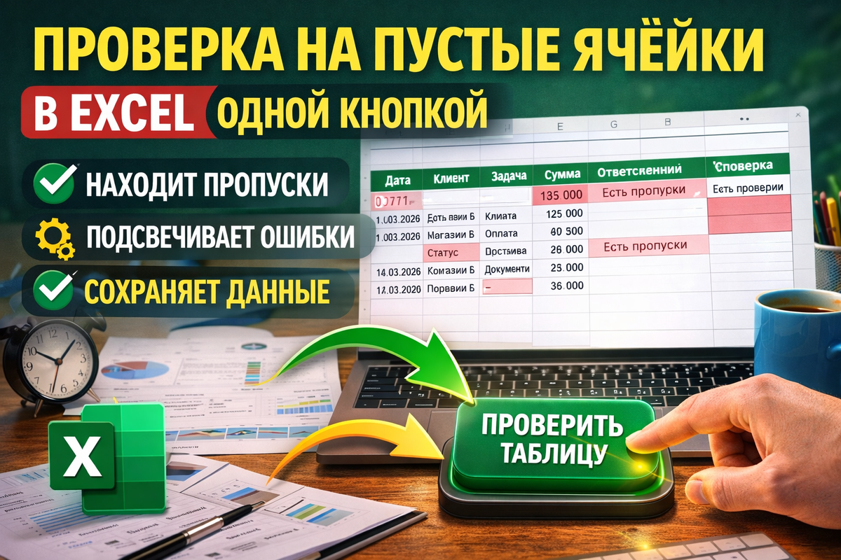Автоматизация в Excel полезна не только там, где что-то нужно красиво собрать, разнести или посчитать. Иногда самый ценный сценарий — это проверка на входе. Убедиться, что данные полные. Что в таблице нет дыр. Что пустая ячейка не уедет дальше в отчёт, письмо, аналитику или задачу сотруднику.
