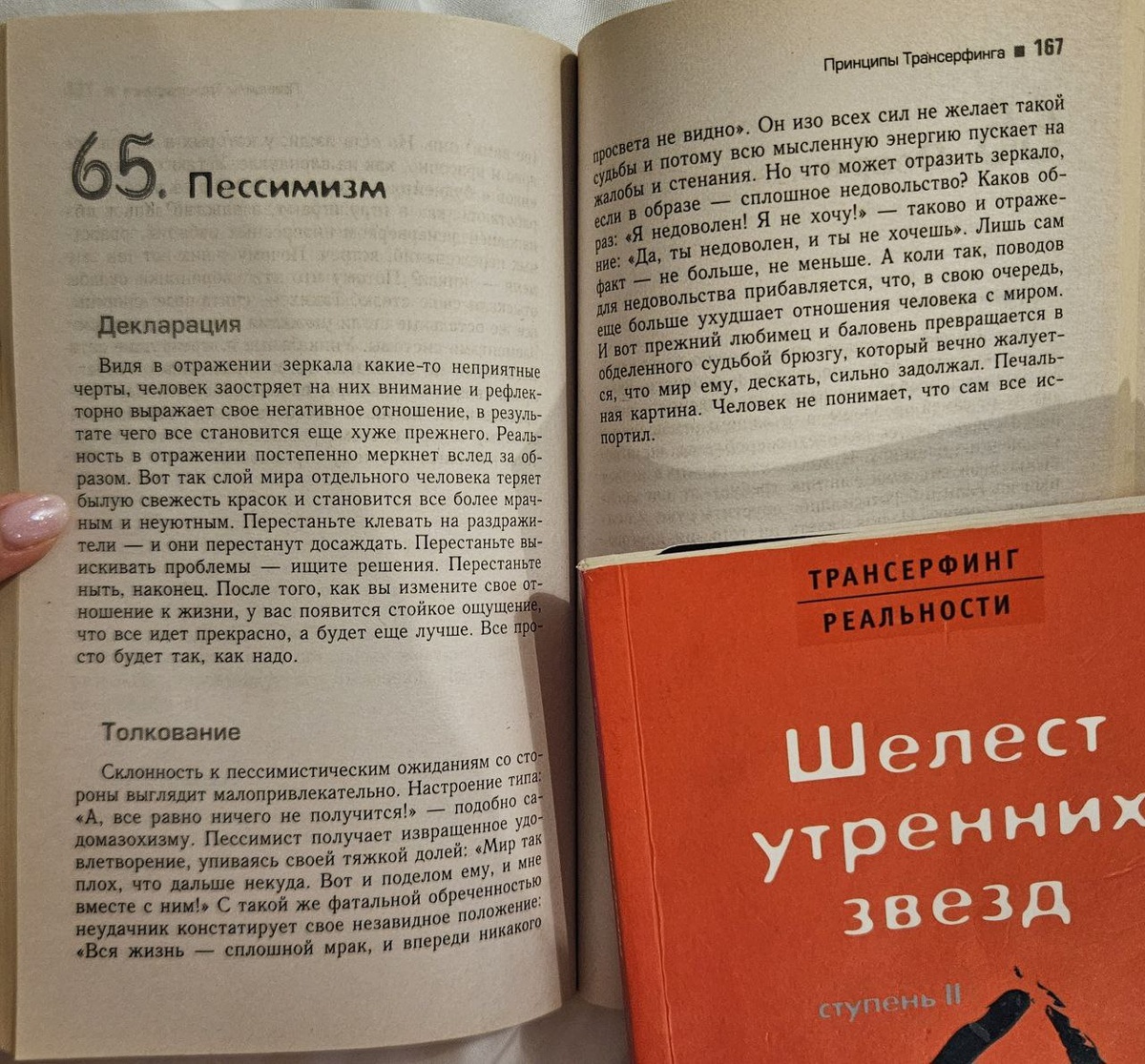 65/78 Практикум управления реальностью - Трансерфинг Пессимизм "Перестаньте клевать на раздражители - и они перестанут досаждать. Перестаньте выискивать проблемы - ищите решения. Перестаньте ныть, наконец. После того, как вы измените свое отношение к жизни, у вас появится стойкое ощущение, что все идет прекрасно, а будет еще лучше. Все просто будет так, как надо." "Пессимист получает извращенное удовлетворение, упиваясь своей тяжкой долей: "Мир так плох, что дальше некуда. Вот и поделом ему, и мне вместе с ним!" С такой же фанальной обреченностью неудачник констатирует свое незавидное положение: "Вся жизнь - сплошной мрак, и впереди никакого просвета не видно." Он изо всех сил не желает такой судьбы и потому всю мысленную энергию пускает на жалобы и стенания. Но что может отразить зеркало, если в образе сплошное недовольство? Какой образ: "Я недоволен. Я не хочу!" - таково и отражение: "Да, ты недоволен и ты не хочешь". Лишь сам факт - не больше, не меньше. А коли так, поводов для