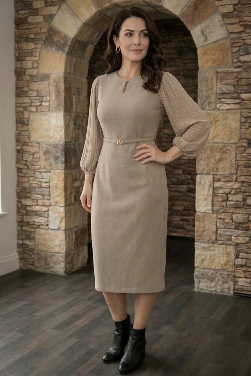 Бежевое платье в рубчик с длинными рукавами-фонариками и золотым поясом демонстрирует этот принцип. Ткань средней плотности не висит мешком, но и не сдавливает. Золотые серьги-кольца добавляют акцент в портретную зону.
