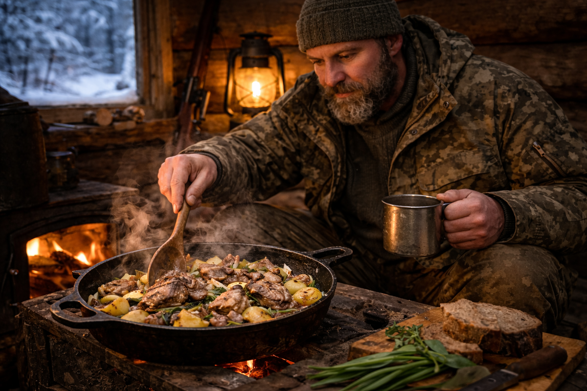 Охотник возвращается к старому зимовью уже поздним вечером, когда над тайгой стоит тишина, а снег тихо поскрипывает под сапогами. За плечами рюкзак, в котором лежит добытый заяц — простая, но очень вкусная дичь, если приготовить её правильно. В избе быстро растапливают печь, ставят на плиту тяжёлую чугунную сковороду и начинают готовить настоящий охотничий ужин. Зайца разделывают на крупные куски — задние ноги, передние лапы и куски спинки. Мясо слегка натирают солью и щепоткой чёрного перца. Пока сковорода прогревается, режут две крупные картофелины толстыми ломтями и одну большую луковицу полукольцами. На горячий чугун кладут небольшой кусок солёного сала, жир начинает тихо шкварчать, и в этот момент на сковороду выкладывают куски зайца. Мясо несколько минут не трогают, чтобы оно взялось румяной корочкой и запечатало сок. Затем куски переворачивают и добавляют нарезанный лук. Через пару минут лук начинает отдавать сладкий сок и смешивается с мясным жиром. После этого на сковороду кла