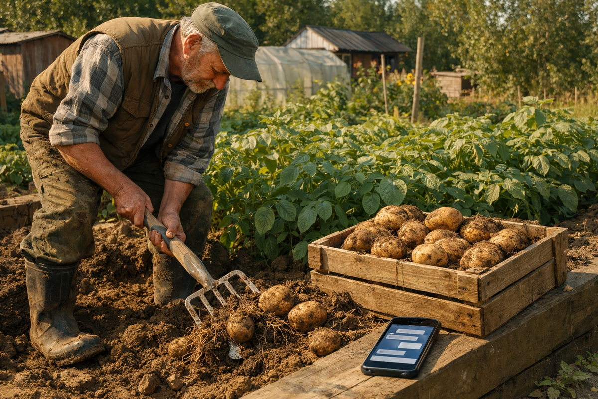 «Как понять, что картофель пора копать? У меня сорт Удача – среднеранний. Ботва уже полегла, но часть ещё зелёная. Расскажи пошагово: как правильно выкопать, просушить и заложить на хранение. Погреб у меня кирпичный, температура зимой держится около 4 градусов»