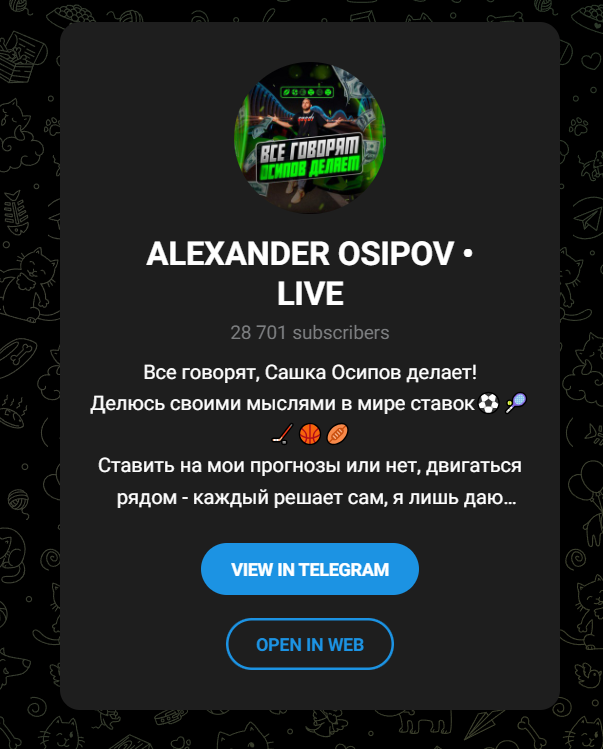 Для охвата максимальной аудитории Осипов создал целую сетку телеграм-каналов: одноименный канал, Alexander Osipov Live, Shark Bet, Осипов Бет и другие. Суммарная аудитория этих ресурсов выглядит внушительно (более 50-120 тысяч подписчиков), однако реальная активность (просмотры постов) катастрофически низкая, что прямо указывает на масштабную накрутку "мертвыми" душами (ботами). Это делается исключительно для пускания пыли в глаза новичкам: большая цифра должна внушать доверие. В самих каналах практически отсутствует аналитика — прогнозы выдаются "всухую", без какого-либо разбора и обоснования.