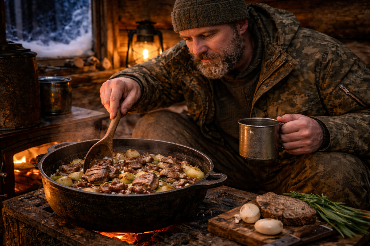 Охотник возвращается к зимовью уже глубокой ночью, когда мороз в тайге становится особенно крепким, а снег под сапогами скрипит так громко, что кажется — его слышно за сотни метров. День был долгий, дорога тяжёлая, но в рюкзаке лежит хороший кусок лосятины, и значит в избушке будет настоящий горячий ужин. Внутри зимовья холодно, стены за день успели выстудиться, поэтому первым делом разжигают печь. Сухие поленья лиственницы быстро разгораются, и через несколько минут огонь начинает ровно гудеть, наполняя избу теплом. На плиту ставят старый чугунный казан — тяжёлый, закопчённый от многих лет таёжной жизни. Пока казан медленно прогревается, охотник достаёт мясо и режет лосятину крупными кусками. В тайге не любят мелко резать дичь — крупные куски лучше сохраняют сок и вкус. На дно казана кладут небольшой кусок солёного сала, которое почти всегда есть в запасе у промысловиков. Сало начинает тихо таять, жир покрывает дно казана, и когда он хорошо разогревается, в казан отправляются куски ло