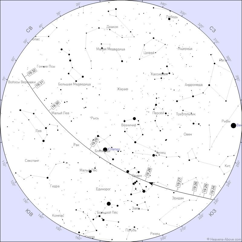 Первое, ещё на вечернем небе, с 19:25 по 19:32. Максимум блеска -3,6 звездных! Это очень большая яркость! При этом высота станции над горизонтом будет 56 градусов. Траектория пролета МЕС пройдет через Эридан, Орион, Близнецы, Рак, Лев, Малый Лев, и станция войдет в тень Земли в Волосах Вероники. Интересно, что МКС пролетит очень близко к Бетельгейзе (альфа Ориона). Именно в этот момент яркость станции достигнет максимума. Далее - пролет рядом с Юпиреом, в Близнецах. Второй полёт МКС над Коымом: с 21:02 до 21:05. Яркость: -2 Всем успехов! #наблюдения #астрономия #МКС