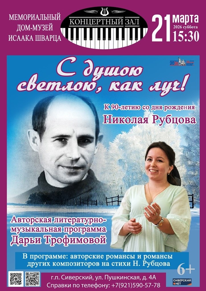 🎼🎶 21 МАРТА 2026 года (суббота) / 15:30 / / АВТОРСКАЯ ЛИТЕРАТУРНО-МУЗЫКАЛЬНАЯ ПРОГРАММА / / К 90-летию со дня рождения НИКОЛАЯ РУБЦОВА / Дорогие друзья! С радостью приглашаем вас на уникальную программу автора-исполнителя, лауреата международных конкурсов Дарьи ТРОФИМОВОЙ (фортепиано, вокал), посвящённую 90-летию со дня рождения великого русского поэта Николая Михайловича Рубцова. Эта программа будет интересна всем ценителям душевной музыки и проникновенной лирики, т.е. всем вам, наши дорогие зрители. Мы познакомимся с биографией Николая Рубцова, его жизненными и творческими исканиями, проследим за непростой судьбой поэта — от его ранних лет до признания в литературе, углубимся в его стихи, которые становятся мелодиями, заполняющими сердца слушателей. Мы услышим, как музыкально звучат слова Рубцова, проникая в самую душу. Не упустите возможность прикоснуться к волшебному миру поэзии и муз Показать полностью... Присылайте ваши новости в сообщения нашего канала Источник: Открыть