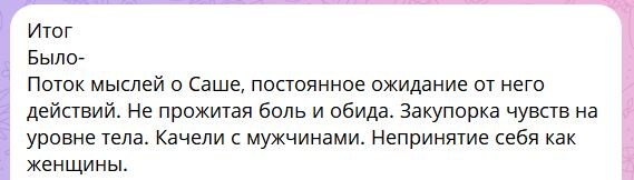 «Больше не триггерит ни одна его измена, прям отпустило, столько энергии и доброты высвободилось»