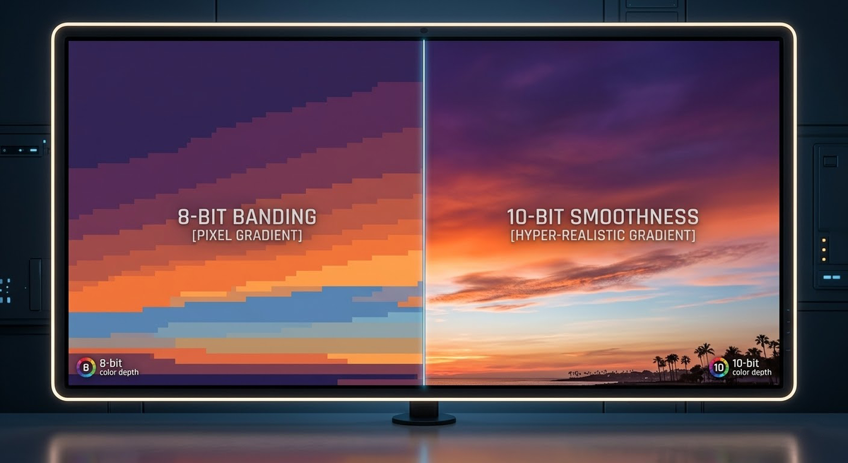 Вы когда-нибудь замечали в играх или фильмах странные «ступеньки» на небе или в тумане? Вместо плавного перехода от темно-синего к светлому вы видите четкие полосы разного цвета. Этот эффект называется бандинг (banding), и главная причина его появления — стандартная 8-битная глубина цвета. Давайте разберемся, зачем переключать ваш монитор в режим 10 бит и что это изменит в вашем повседневном опыте. Глубина цвета определяет, сколько оттенков может отобразить монитор: Разница колоссальная — в 64 раза больше оттенков! Даже если ваш глаз не различает миллиард цветов по отдельности, он отлично видит отсутствие переходов между ними. Многие мониторы по умолчанию работают в 8-битном режиме, даже если могут больше. Важно: Если пункт 10 bpc не появляется, попробуйте снизить частоту обновления (например, со 165 Гц до 144 Гц) или заменить кабель HDMI на качественный DisplayPort. Пропускной способности старых кабелей часто не хватает на «всё и сразу». Переход на 10 бит — это круто, но стоит учитыва