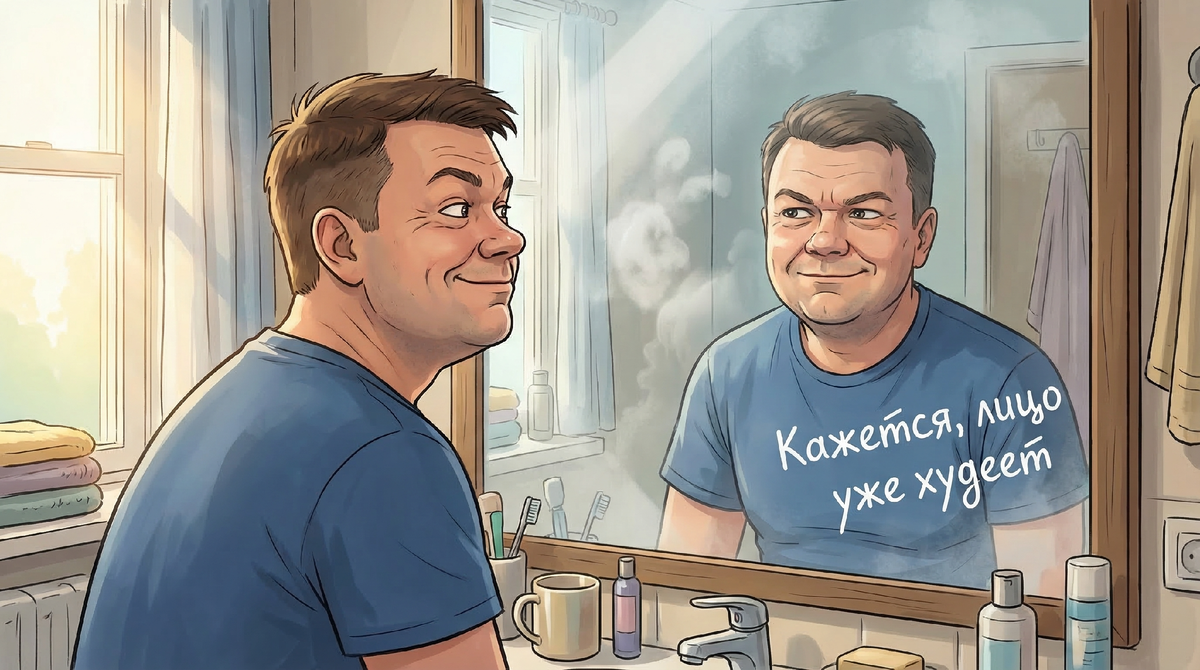 Первые килограммы я встретил как человек, которому лично подтвердили: да, чудо возможно, продолжайте в том же духе. Утром встал на весы. Увидел минус. И испытал такой прилив гордости, будто не просто меньше съел на неделе, а спас деревню, построил мост и отказался от торта в очень тяжёлых моральных условиях. ____________________________________ Снаружи это был всё тот же Вадим — в трусах, сонный, с отпечатком подушки на щеке. Но в голове я уже жил в светлом будущем. Там я легко выбираю одежду, бодро поднимаюсь по лестнице и двигаюсь по жизни как человек, который однажды взял себя в руки и больше не выпускал. ____________________________________ Не потому что там что-то изменилось. Просто мне казалось, что в лице появилась какая-то новая собранность. Такая, знаете, худеющая. Жена поймала меня за этим занятием. — Ты чего стоишь? — Смотрю на себя. — И как? — Получше, — сказал я с достоинством. — Ага, — говорит жена. — Я тоже заметила. Ты уже минут пять как похудел. Я решил не реагировать