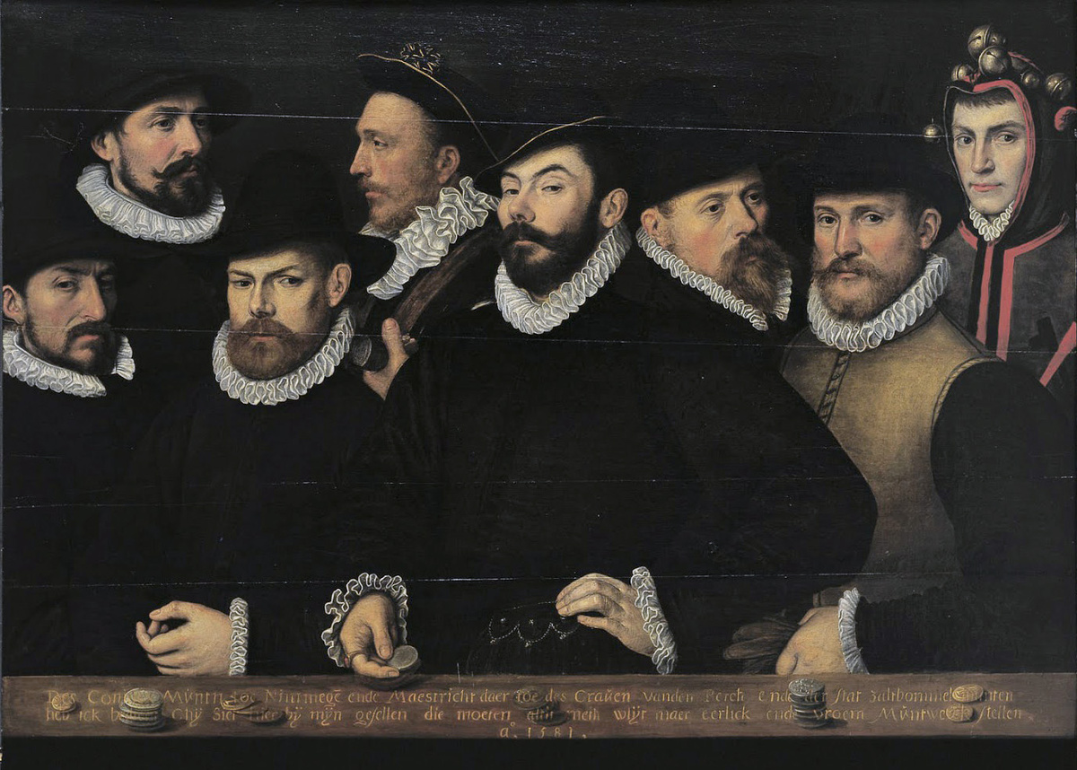 Перед нами картина неизвестного немецкого художника XVI века. Это редкий портрет мастера монетного двора и его спутников. В те времена чеканка монет осуществлялась в монетных дворах, которыми руководил местный предприниматель — монетный мастер (Muntmeester). Этот монетный мастер обычно назначался правительством и обладал правом чеканки монет. Он не только управлял монетным двором, но и получал прибыль — она представляла собой разницу между стоимостью материалов (золота, серебра и т.д.) и номинальной стоимостью монет. Другой чиновник, надзиратель (Waardijn), выступал в качестве непосредственного представителя правительства и проверял качество создаваемых монет. Каждый год владелец монетного двора также платил правительству сеньораж (Sleischat) — специальный налог. На картине изображен такой владелец монетного двора Клеменс ван Эмбрюгге, владелец монетного двора из Залтбоммела — он стоит в центре и держит монету. На картине Клеменс изображен с семью товарищами, которые помогали ему