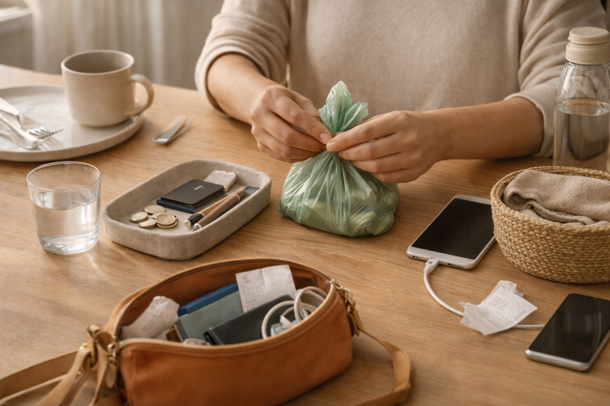Что лучше сделать: сразу выкладывать всё в одно понятное место — лоток, коробку, небольшую корзину. Это не про педантичность, а про то, чтобы не жить потом в постоянном поиске ключей и наушников.