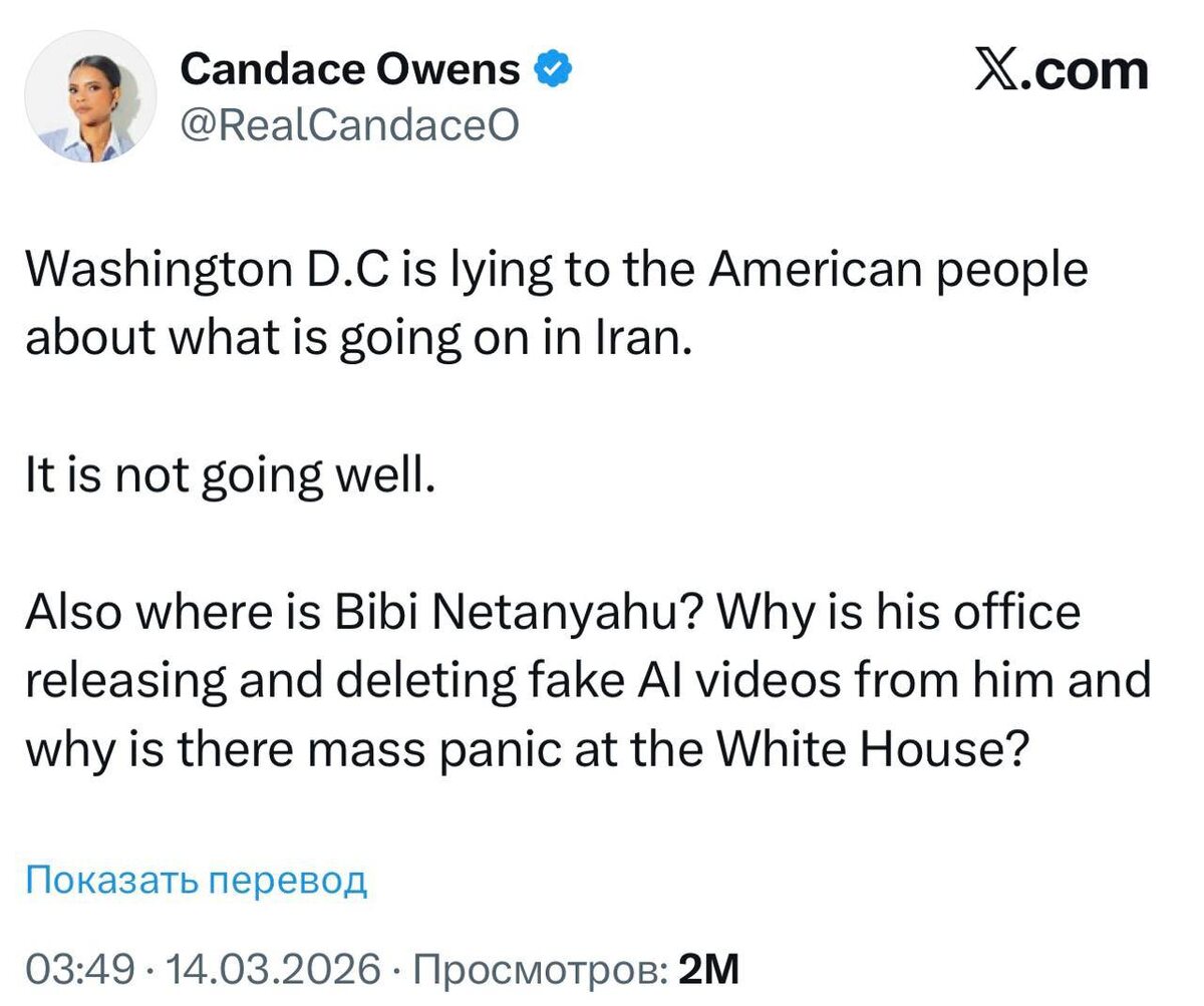 : «Вашингтон лжет американскому народу о том, что происходит в Иране. Дела идут плохо. А где же Нетаньяху? Почему его администрация публикует и удаляет фейковые видео с его участием, созданные искусственным интеллектом, и почему в Белом доме царит массовая паника?». 🤗 НАСОНОВ ▶️