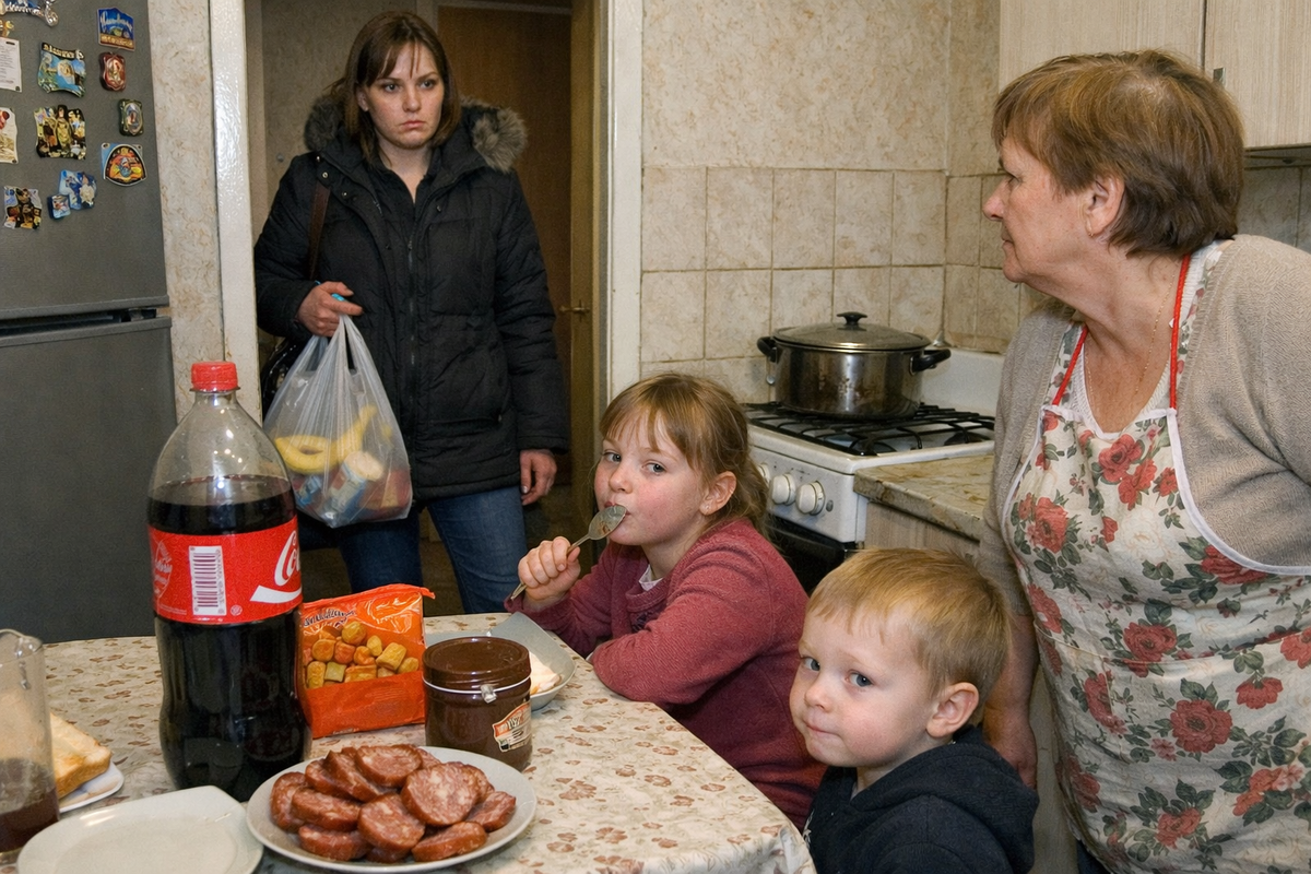 На столе стояла двухлитровая кола — уже открытая. Рядом пачка ярко-оранжевых сухариков, пластиковая банка шоколадной пасты и тарелка с копчёной колбасой — жирной, блестящей по краям. Полина, которой гастроэнтеролог месяц назад запретил газировку и острое после приступа, сидела с красными щеками и облизывала ложку. Артём макал хлеб в пасту и замер, как пойманный.