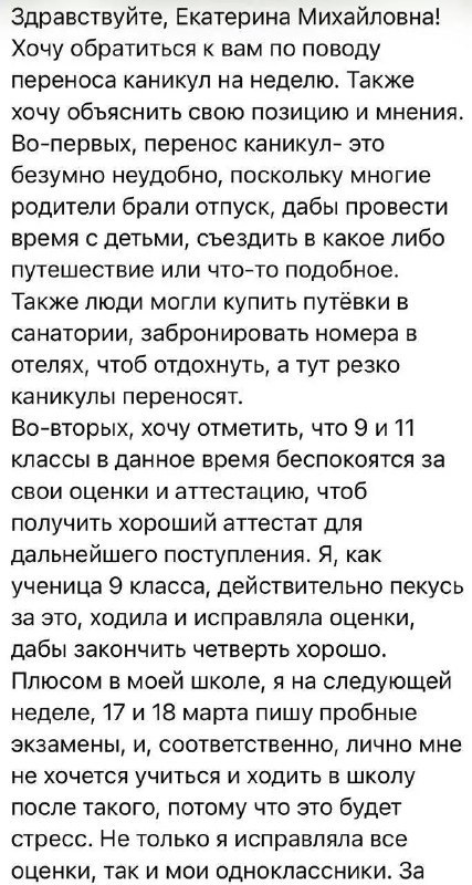 В Воронеже школьники пожаловались сенатору Екатерине Мизулиной на перенос весенних каникул с 21 на 28 марта