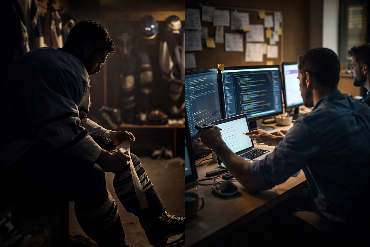 За последние несколько публикаций я рассказал первую часть своей истории. Про маленький уральский город, где хоккей — почти религия. Про годы на льду, юниорское чемпионство мира, травмы и момент, когда пришлось принять решение завершить спортивную карьеру. И про тот странный переход из мира постоянного движения в мир экранов, таблиц и первых проектов в IT. Но если оглянуться назад, становится понятно: всё самое важное в этих событиях происходило не на поверхности. Большинство людей видят только результат. Кто-то — медаль на шее спортсмена. Кто-то — готовый сайт или работающую систему. Но почти никто не видит того, что происходит до этого момента. Именно поэтому я назвал эту книгу «Невидимый цех». Когда мы смотрим на результат, он кажется естественным. Будто всё получилось само собой. Спортсмен вышел на лёд и выиграл матч. Команда разработчиков запустила сайт. Компания внедрила новую систему. Но за каждым таким результатом стоит огромный пласт работы, который редко попадает в кадр. В сп