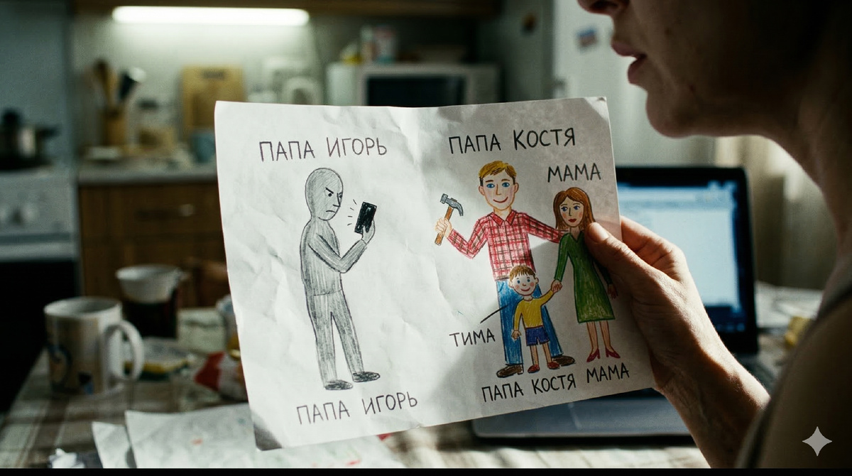 Моя мама — женщина мудрая, пережившая тяжелый развод с моим отцом, который тоже когда-то выбрал работу и друзей вместо семьи. Услышав мой срывающийся голос, она не стала перебивать. Она слушала, как я захлебываюсь слезами, рассказывая про этот проклятый рисунок, про «папу Костю» с молотком и про серую тень с телефоном.