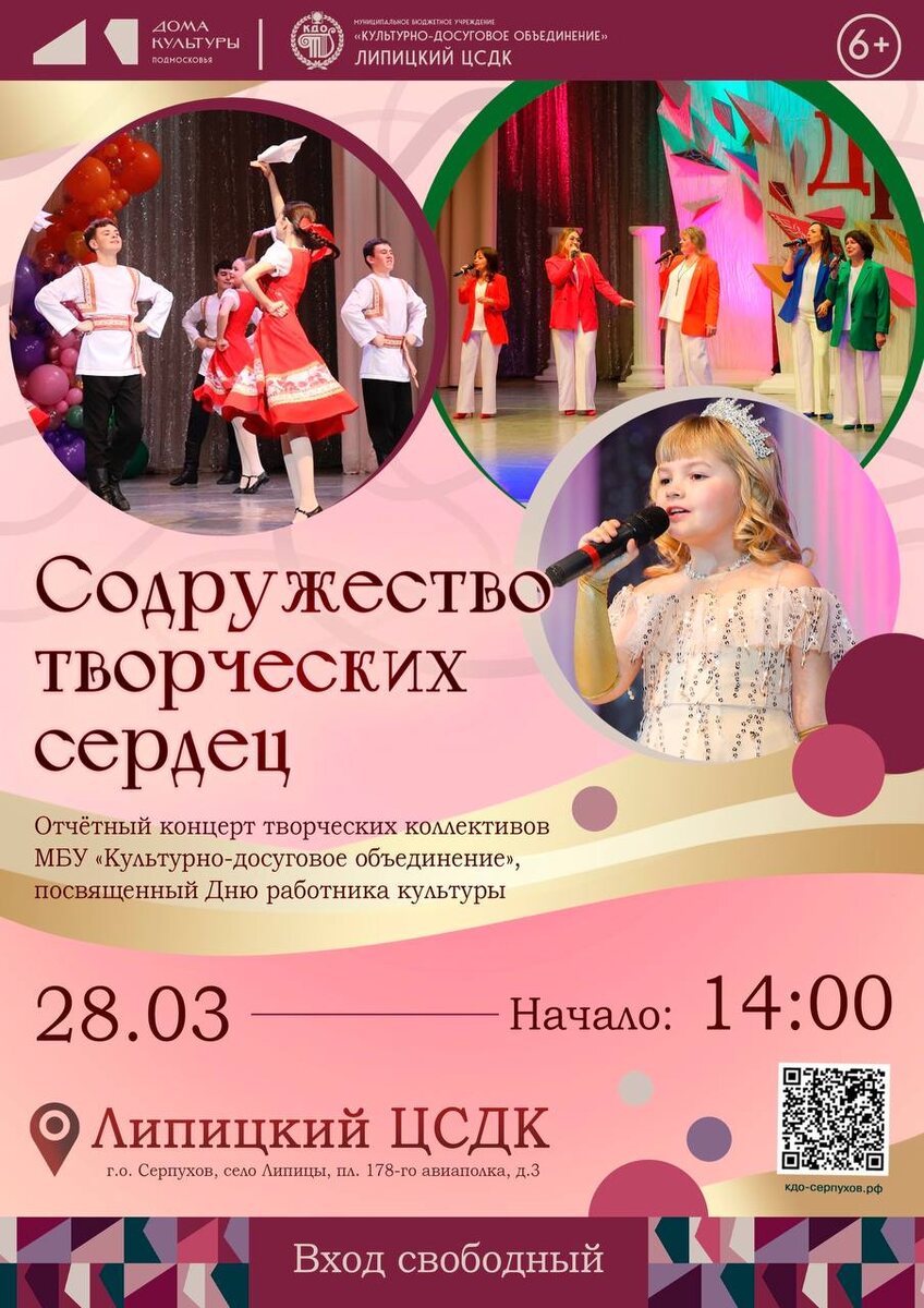 ! 28 марта в Липицком ДК — Отчетный концерт творческих коллективов МБУ «Культурно-досуговое объединение» Городского округа Серпухов «Содружество творческих сердец», приуроченный ко Дню работников культуры. Для вас выступят победители международных и всероссийских конкурсов. Это не просто концерт, а настоящий праздник весны и искусства! В программе: ✅ Вокал и хореография ✅ Сольные номера ✅ Церемония награждения работников культуры ✅ Выставка и мастер-классы в фойе 🗓 28 марта, 14:00 📍 Серпухов, с. Липицы, д.3 Вход свободный