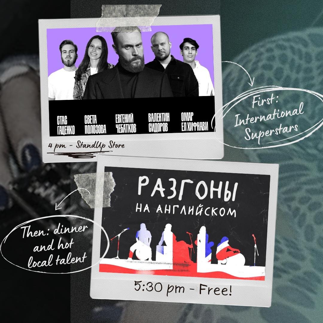 ! First, come over to our monthly СТЕНДАП НА АНГЛИЙСКОМ ЯЗЫКЕ at StandUp Store to see some famous faces, including Yevgeniy Chebatkov and Valentin Sidorov... 🕓Time: 16:00 🗺Address: Petrovka 21c1 🎫Entrance: 1150 rub 🔗Buy tickets here Then take a quick jog around the corner to Stand Up Club on Trubnaya for dinner and drinks at Razgony in English, where you'll sit down with the comedians for an improvised, intimate conversation with lots of laughs 🕯🍷 🕠Time: 17:30 🗺️Address: Rozhdestvensky Blvd, 10/7 С1 🎟️Entrance: donations welcome + mandatory purchase of any food 🥗 or drink🍸 🔗Click to reserve seats here!