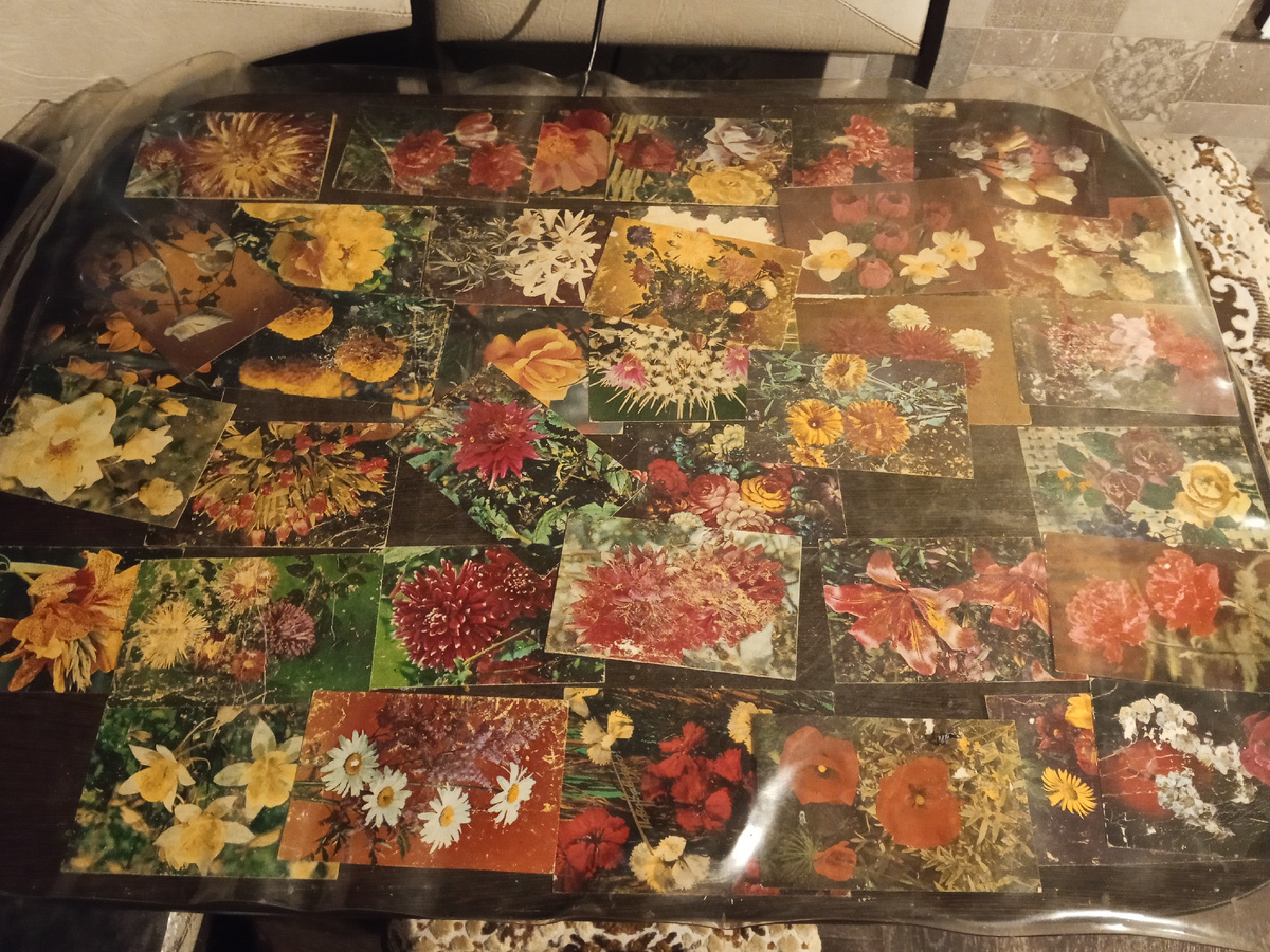 Кузанный стол с открытками смотрится ужасно , потому что идея с открытками была не доработана до конца. Они облезли а силиконовая прозрачная клеенка выцвела и скукожилось. Изначально открытки я подбирала в цвет кухонного гарнетуру.Шкафы у меня темно-коричневого цвета. Мне захотелось сделать дизайн клеенки в кофейном цвета . и тут в голову пришла идея: либо из остатков обоев выложить