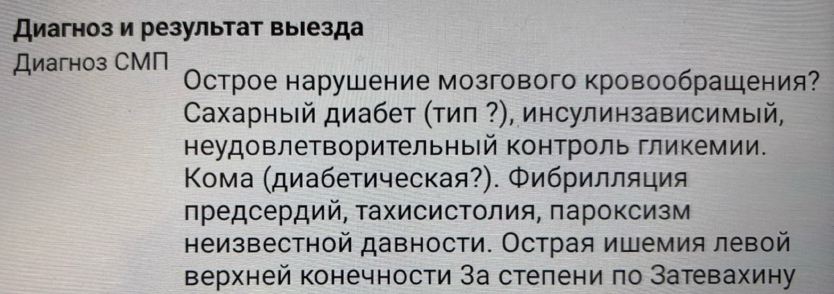 Зимнее утро. За минуту до начала смены на планшет поступил вызов: «Без сознания. Лежала на полу. Женщина, 81 год». Больше информации нет, как обычно, придется разбираться на месте. Проехав совсем немного, наша Газель свернула в арку и остановилась возле подъезда панельной пятиэтажки. На втором этаже «ждала» приоткрытая дверь нужной квартиры. Мы вошли внутрь. В маленьком коридоре ждала целая делегация: сын, муж пациентки, а также часть неравнодушных соседей, считавших своей главной задачей оповестить медиков о предположительном диагнозе, а также о том, как надо лечить больного. Женщина была в комнате. Она лежала на кровати, не подавая признаков сознания, но, помимо этого, в глаза бросалось два симптома: «парусящая» при дыхании щека, а также неестественно бледно-желтая левая рука, с уже посиневшими согнутыми пальцами. От мужа пациентки, в основном ввиду возраста, а также переживания за супругу, информации получить практически не вышло, а вот сын, бесконечно повторяющий о нашей обязанност