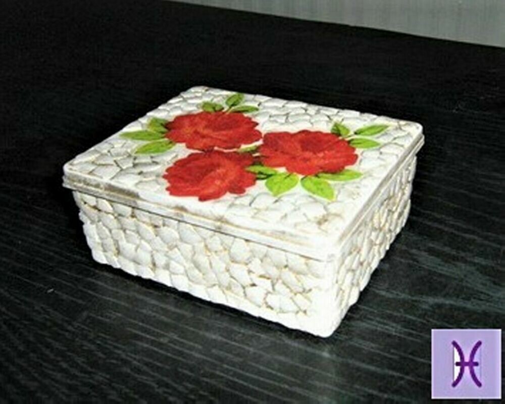 Добрый день друзья. Вот скажите, пожалуйста, мне, чем вы занимаетесь с внуками, когда вас просят “посидеть” с ними? Когда зима, а погода такая, что “добрый хозяин собаку на мороз не выставит”. Вот как в этом году в большинстве регионов. Или проливной дождь. Предлагаю рассмотреть вариант изготовления шкатулочки из обычной пластиковой коробочки. С такой работой справится любой ребенок. Наверное, кроме грудничка. Итак. Нам потребуются: - пластиковая коробочка - спиртовые салфетки (продаются в аптеках) - красивая салфетка для декупажа - яичная скорлупа - белая акриловая краска - клей ПВА для приклеивания салфетки - клей, типа Титан, для приклеивания скорлупы - лак, типа паркетного на водной основе, без запаха - золотой порошок металлик Работу над шкатулочкой начинаем с того, что пластиковую коробочку со всех сторон зачищаем наждачной бумагой, для того чтобы поверхность пластика была шероховатой. Затем, коробочку тщательно моем. Далее, стенки коробочки необходимо обезжирить при помощи спир