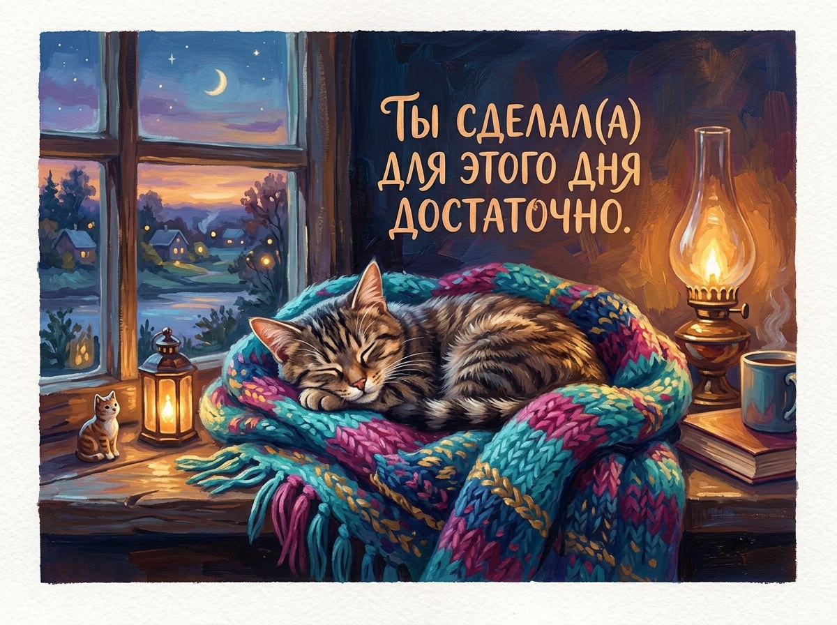 Сейчас вечер мягко укутывает мир, и я, маленький кот, пришёл напомнить тебе: ты сделал(а) для этого дня достаточно