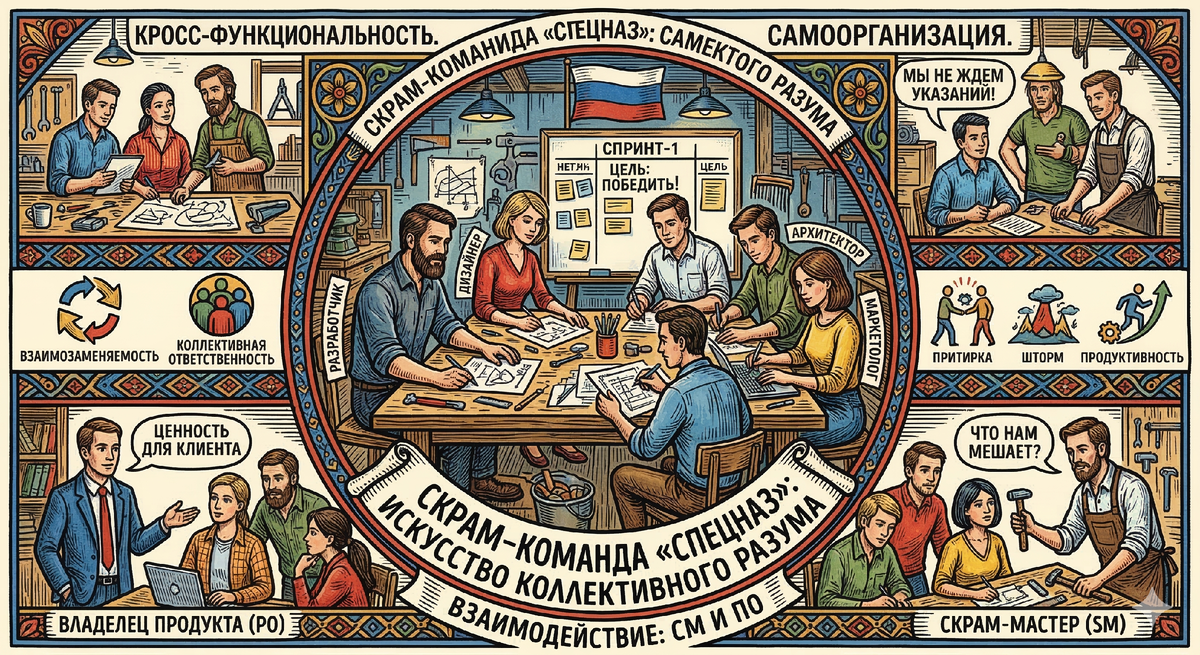 Давай сразу определимся: Скрам-команда — это не отдел, где каждый сидит в своем углу и ждет указаний начальника. Это кросс-функциональная группа людей, у которых есть все необходимые навыки, чтобы довести задачу до финиша самостоятельно. В идеальном мире им не нужно ни у кого просить помощи или согласования.