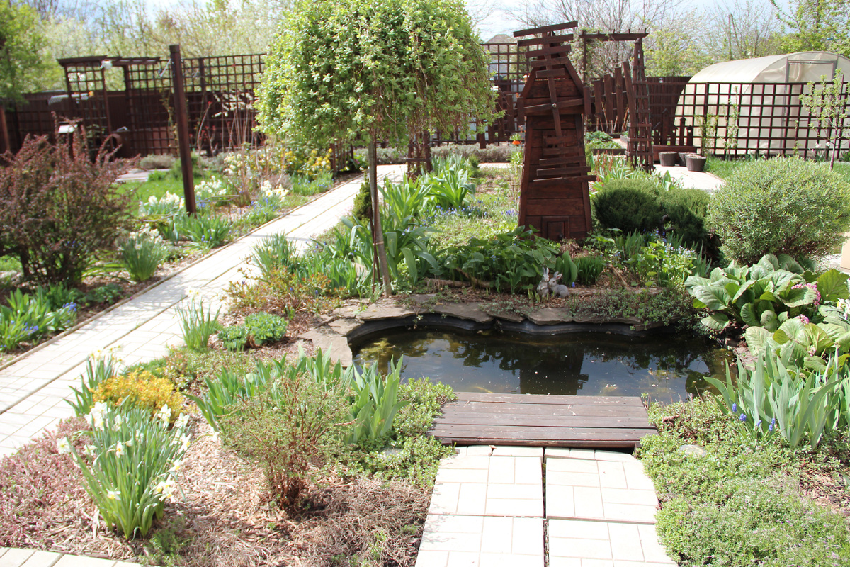 Сегодня покажу часть большого центрального цветника. Обозначу его как цветник у пруда. Здесь растут: ива козья Килмарнок на штамбе, пурпурная ива Нана, спиреи Голдфлэйм, спирея с зеленым листом (пересорт), лапчатка кустарниковая, хосты, баданы, ирисы, шиловидные флоксы, нарциссы, тюльпаны, очитки, очитки почвопокровные, мшанка, мускари, бересклет Форчуна, бруннера, маргаритки. Весеннее цветение у пруда начинается с нарциссов и баданов. Кое где можно увидеть мускари. Далее к цветению присоединяются шиловидные флоксы и тюльпаны. Когда-то у мельницы я посадила видовую бруннеру. Симпатичное растение, но ведет себя довольно агрессивно. После цветения обычно вырываю все вместе с листьями, но это ее не останавливает. Очень красива в сочетании с тюльпанами. К концу мая подтягиваются ирисы. Ирисы здесь разного срока цветения. В июне цветут крупные сортовые ирисы. Люблю цветение спирей. Обрезаю после него. Кто-то режет до цветения, формируя плотный куст. Мне жаль срезать эту нежнятину, да и пл