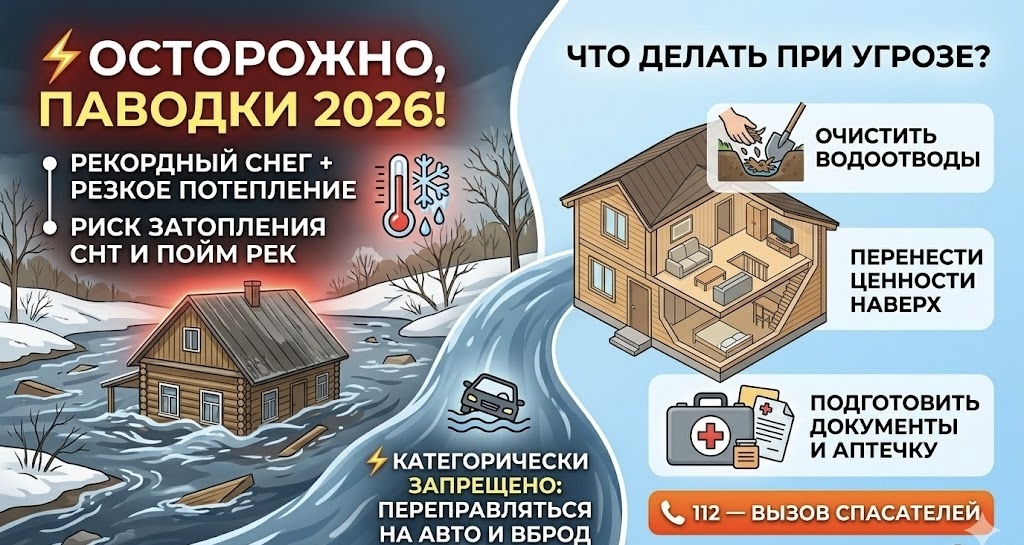 Рекордные сугробы против резкого плюса: Мы в зоне риска? Зима 2025–2026 годов запомнится жителям столичного региона небывалыми снегопадами. Теперь, когда весна окончательно вступила в свои права, весь этот накопленный объем воды устремился в почву и русла рек. Из-за резкого потепления Подмосковье столкнулось с угрозой экстремального паводка. В этом году в зоне особого риска оказались не только поймы рек, но и СНТ, расположенные в низинах. Талая вода — это не просто лужи, а мощная стихия, способная подмыть фундамент, разрушить дорогу к вашему участку и вывести из строя коммуникации. Что категорически нельзя делать: 4 «НЕТ» в период половодья Многие недооценивают опасность «большой воды», допуская фатальные ошибки. Запомните эти правила: Не пытайтесь форсировать реки и затопленные участки дорог. Даже если вам кажется, что «тут неглубоко», поток воды глубиной всего 30 см способен с легкостью смыть легковой автомобиль в кювет. Забудьте про лед. Выход на подтаявший лед или попытки прокати