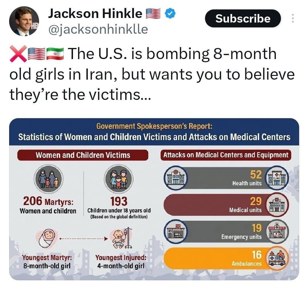 : "Соединенные Штаты бомбят 8-месячных девочек в Иране, но хотят, чтобы вы поверили, что они жертвы..." #сша #иран 💬Jackson Hinkle, American political commentator and blogger: "The United States is bombing 8-month-old girls in Iran, but they want you to believe that they are victims..." #usa #iran