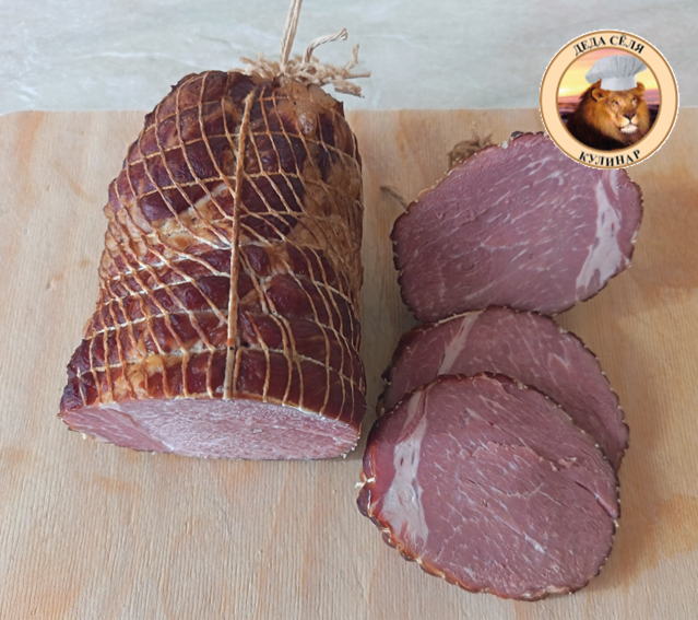 Ингредиенты: 1. Шея свиная 1000 г; 2. Вода 380 мл; 3. Соль нитритная 13 г; 4. Соль поваренная 15 г; 5. Сахар 1,5 г; 6. Перец чёрный молотый 2 г; 7. Чеснок свежий измельченный 15 г. Приготовление: 1. В воде растворяем сахар, соль поваренную и соль нитритную. Сырьё шприцуем полученным рассолом (50 мл). Нашприцованное сырьё укладывают в ёмкость, добавляем перец и чеснок, заливаем оставшимся рассолом. 2. Ёмкость со свиной шеей отправляем в холодильник на 2–3 суток при температуре 2°С-4°С для засола. 3. Посоленное сырьё промываем под прохладной водой, укладываем в формовочную сетку и вывешиваем при температуре 2°С-4°Сна 4-6 часов, для подсыхание. 4. Подсохшею свиную шею коптим при 30°С-50°С в течении 6-8 часов. 5. Копчёный продукт варим при температуре 75°С-85°С до достижен