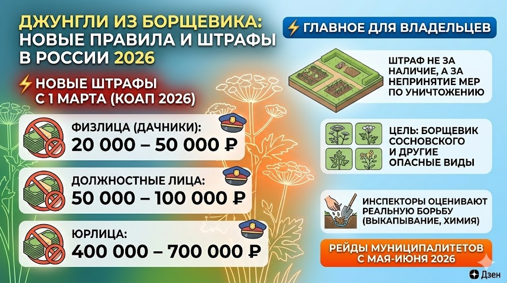 Новые штрафы за борщевик Сосновского на дачных участках с 1 марта 2026 года. Размеры штрафов для физических лиц, правила борьбы с инвазивными растениями и как избежать наказания в новом дачном сезоне. Борщевик больше не «соседская проблема»: Теперь это закон До недавнего времени за заросли борщевика Сосновского наказывали в основном владельцев сельхозугодий и крупных латифундистов. Садоводы и дачники в СНТ могли годами игнорировать «зеленого монстра» за забором. С 1 марта 2026 года ситуация изменилась радикально. Вступил в силу федеральный закон, который уравнял всех владельцев земли. Теперь борьба с инвазивными (чужеродными и опасными) растениями — это обязанность, а не добрая воля каждого собственника, будь у вас 6 соток или гектар. Цена бездействия: Сколько придется заплатить? Муниципальные инспекторы и Россельхознадзор начнут массовые рейды уже в мае-июне, как только борщевик станет заметен невооруженным глазом. Суммы штрафов в 2026 году способны пробить серьезную брешь в семейн