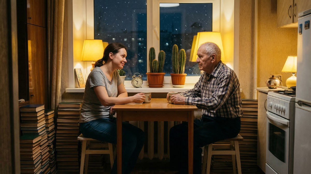Кухня у него оказалась огромной — видимо, когда-то снесли перегородку. Вдоль стен высились горы книг. Прямо на линолеуме, стопками, потому что полки давно закончились. На подоконнике ютились три толстых кактуса и старый советский будильник. Идеальная, стерильная чистота.