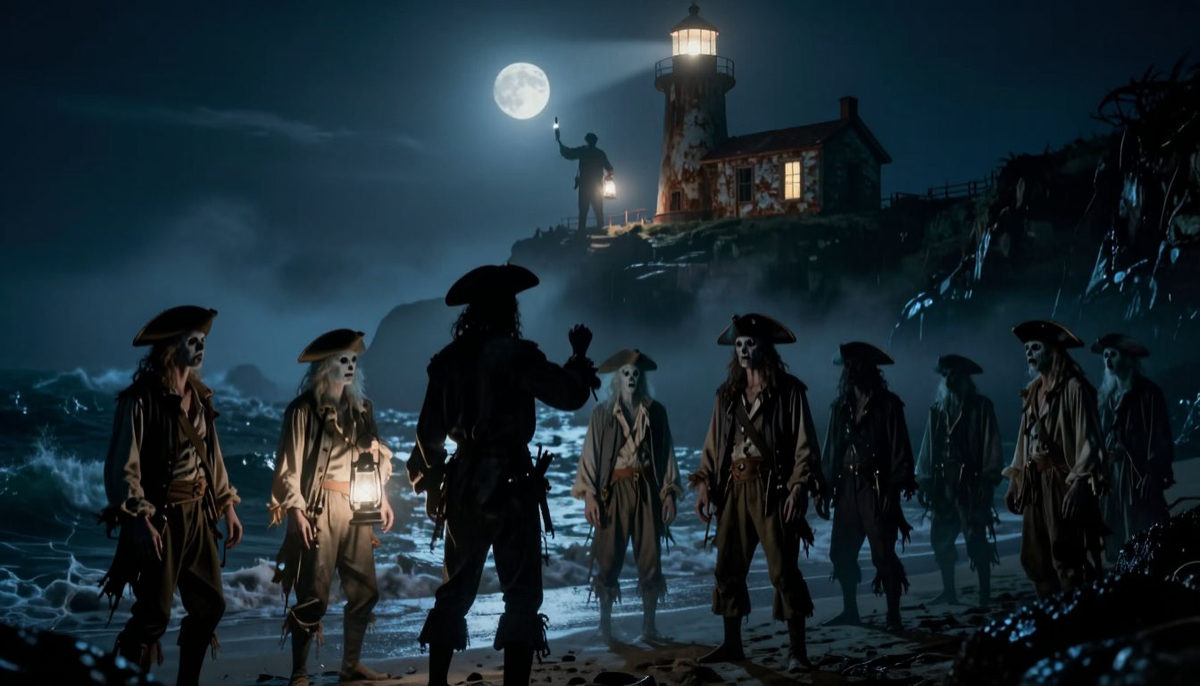 Он сидел у окна, листал потрёпанный журнал, когда вдруг заметил движение за стеклом. Выглянув, он замер. По берегу шли люди — человек десять или больше. Они были одеты в лохмотья, напоминающие морскую форму XVIII века: широкие штаны, рваные рубашки, треуголки. Лица у них были бледные, почти прозрачные, а глаза — тёмные, пустые, будто дыры в пустоту. Один из них, высокий мужчина с повязкой на глазу и длинной бородой, обернулся и посмотрел прямо на Томаса. Смотритель отпрянул от окна, но через секунду осмелился выглянуть снова. Призраки стояли у подножия маяка, поднимая руки к свету, будто пытались дотянуться до него.