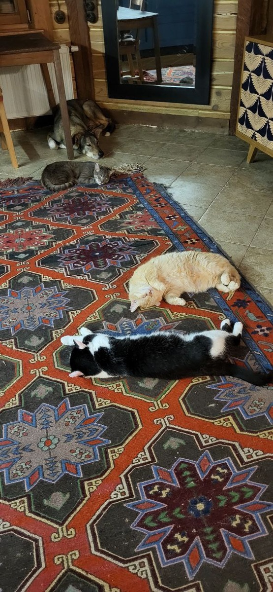 ))) Поняли, что делить нечего: ковра и жрачки хватит всем, а значит можно не бить морду друг другу в целях уменьшения поголовья. Иначе прилетит по башке всем от хозяйки и тогда уж точно своей головы не сносить никому из дебоширов)) Поэтому ковер обетованный; Мир, дружба, жвачка)) Я лишь напомню, что этот черно-белый, Кекс, был вручен мне как супер агрессор-убийца кошечек, а Сережа ну этот опытный чувак, он всех встречал до недавнено времени на подступах к дому! чтоб враги не проникли в дом и шагу по родной земле родного сада не ступили)))