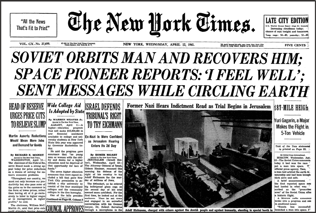 В СССР эту фразу можно было услышать из каждого утюга. Она регулярно звучала в речах партийных лидеров, ее можно было прочитать на страницах газет («Правда», «Известия»), в журналах, услышать по радио и телевидению. Названия статей и передач часто обыгрывали этот штамп, например, «Два мира - два итога» или «О мирном сосуществовании двух систем» . Целью было противопоставить «счастливую жизнь» в СССР «звериному оскалу капитализма», где «человек человеку — волк» . Я решил использовать этот советский штамп для показа того, как в этих двух мирах освещали знаковые события в космонавтике той и другой стороны. Начнем с Гагарина и пройдемся до марта 1965 года. Посмотрим, как и сколько сообщали своим читателям ведущие газеты двух стран (двух миров) "Известия" и "Нью-Йорк Таймс" 12 апреля 1961 года - полет вокруг Земли. О полете Нью-Йорке Таймс написал в тот же день - 12 апреля. Что-то там с часовыми поясами. Успели. На первой странице, но всего три сообщения. Зато 13 апреля только про полет