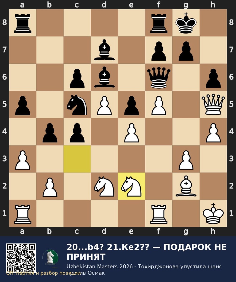 IV International Women's Chess Championship Uzbekistan | Masters, 9-й тур. Гулрухбегим Тохирджонова — Юлия Осмак 0:1 Ключевой момент случился на стыке 20-го и 21-го ходов. После 20...b4? чёрные впервые слегка отпустили позицию — вместо этого точнее было просто подтянуть ладью ходом ...Лfd8. Но белые подарок не приняли: 21.Кe2??. Нужно было 21.Кd1!, собрать фигуры и держать Каталонку в игре. После этого Осмак быстро вернула себе инициативу, сняла коня на c1 и перевела борьбу в нервный эндшпиль с далёкой проходной. Дальше партия превратилась в гонку: пешка h у белых против проходной b у чёрных. Осмак ферзевала первой и на 48...Лd1 окончательно закрыла тему. Разбор в study: https://lichess.org/study/PtlB9hgN/4QKPjWoJ