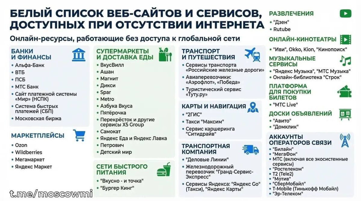 ❌ Список сервисов из «белого» списка, которые работают при отключении интернета в Москве и Подмосковье
