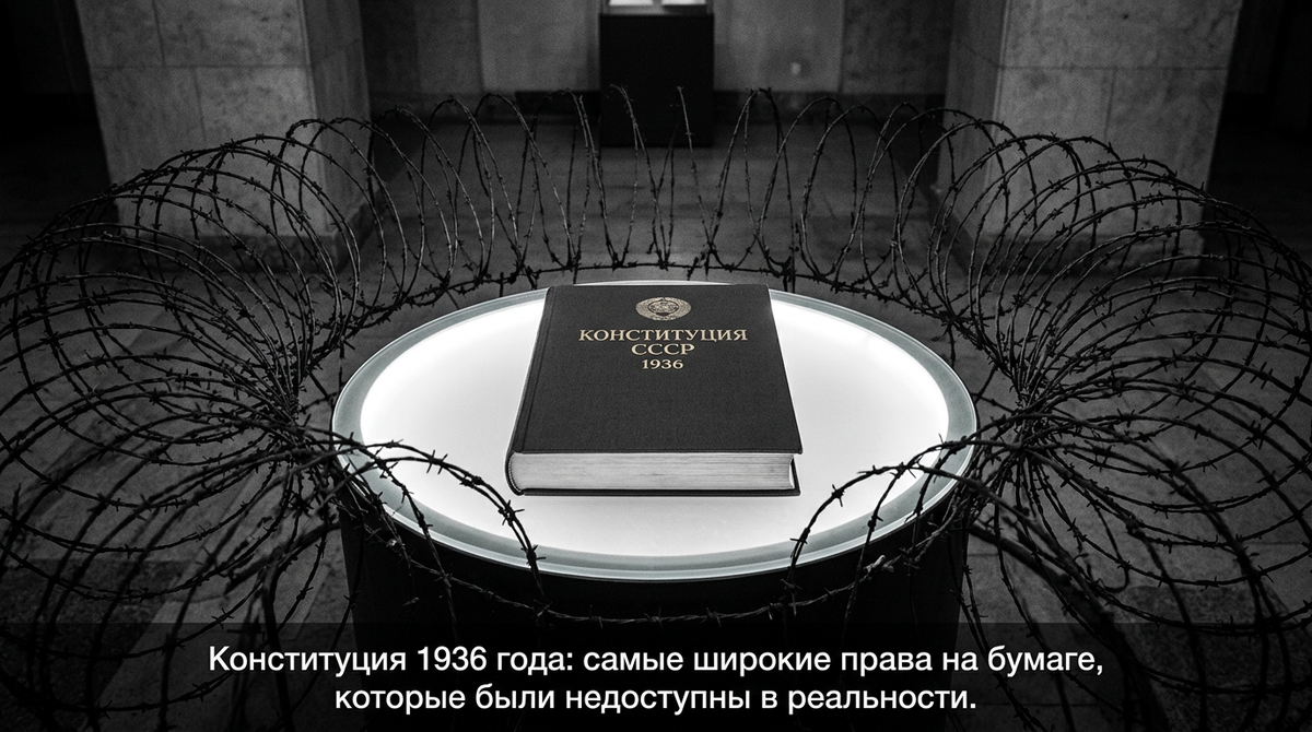 - В 1936 году СССР выкатил новую Конституцию («Сталинскую»). На бумаге это был абсолютный шедевр демократии: всем дали равные права голосовать (понятие «лишенец» удалили), провозгласили свободу слова, печати, неприкосновенность личности и шикарные социальные гарантии (8-часовой рабочий день, пенсии, бесплатная медицина).