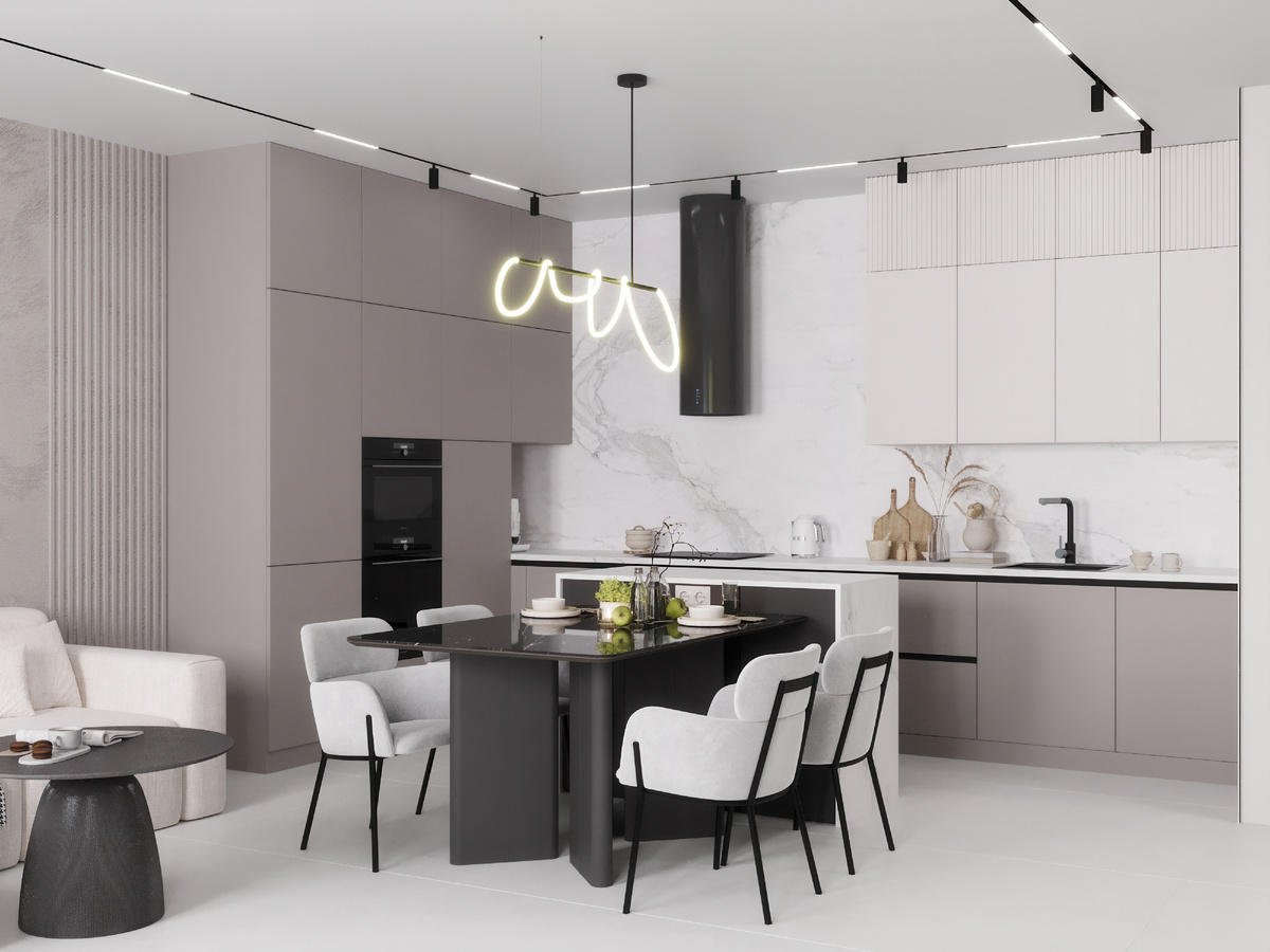 Интерьер выполнен в спокойной нейтральной палитре с мягкими бежевыми, серыми и древесными оттенками, создающими уют и гармонию. Прихожая в нейтральных оттенках, со скрытыми дверями и линейным освещением. Зеркало визуально расширяет пространство, а небольшой пуф добавляет комфорт. Объединённое пространство с светлыми стенами и мебелью. Плитка под мрамор добавляет глубину, кухня лаконичная с чёрной техникой. Обеденный стол — центр семейных ужинов, мягкий диван и ТВ-зона с подсветкой создают уютную и цельную композицию. Светлая и минималистичная. Большие окна наполняют светом, кресло с небольшим столиком создают зону отдыха, а компактная спортивная зона делает пространство функциональным. Санузел аккуратный и функциональный. Светлая плитка и плитка под камень создают глубину, чёрная сантехника добавляет графики. Подвесная тумба с деревянной текстурой и зеркало с подсветкой делают пространство удобным и уютным, а ниша с подсветкой — место для хранения и декоративный акцент. Над проектом ра