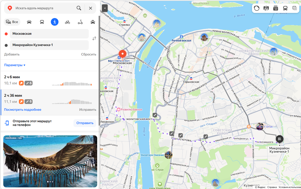У меня был опыт пеших прогулок в молодости от Московского вокзала до микрорайона «Кузнечиха-I», где я жил в первой половине 1990-х годов. Тогда я работал в рекламной компании, занимавшейся размещением наклеек на стенах вагонов метро. Наклейки мы клеили в поездах, ночевавших в электродепо на станции «Пролетарская». Потом на последнем поезде добирались до станции метро «Московская», а оттуда, если повезёт, я успевал на последний автобус до милой сердцу Кузнечихи. Несколько раз не успевал, поэтому приходилось идти пешком. Было это в первом часу ночи. Такая прогулка занимала более полтора часов быстрым шагом, примерно 1 час 45 минут. В Яндекс-картах время на этот маршрут слишком завышено. Или я в то время очень быстро ходил. Но метромоста в то время ещё не было, чтобы сократить путь по нему.