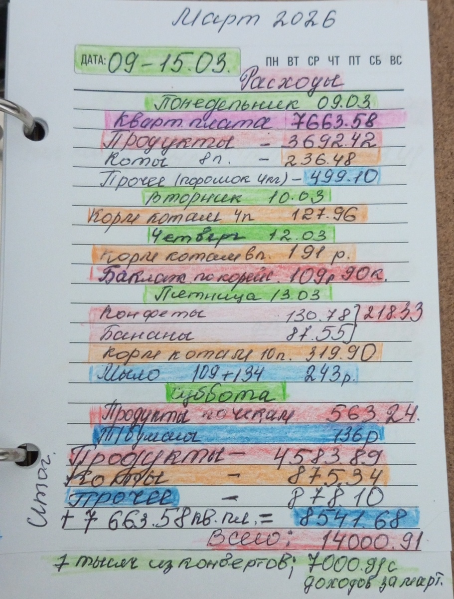 🙋♀️💞 С 09-15 марта мы потратили 14000.91 руб. На питание потрачено чуть больше, чем планировали, не критично, т.к. продукты остались, а это значит на следующей неделе расход на продукты будет меньше лимита в 4 тысячи (не факт, но хотелось бы).