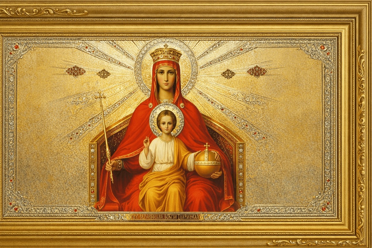 Однако сердце подсказывает иное. Спустившись в подвал (подклет) храма, где хранились старые, обветшавшие иконы, среди досок, щепок и мусора они находят ту самую большую, почерневшую от времени икону. Когда ее начинают промывать, взору открывается величественная картина: Пресвятая Богородица восседает на троне как Царица Небесная. На Ее коленях — Богомладенец Христос, благословляющий мир. В руках Пречистой — скипетр и держава, регалии царской власти. На Ней пурпурная царская одежда, а глава увенчана короной.