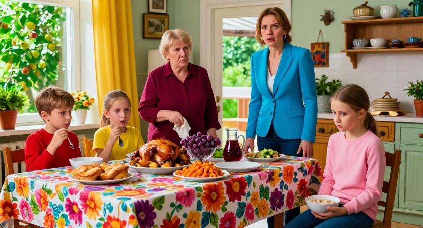 В столовой стало так тихо, что слышно было, как в старом холодильнике на веранде дребезжит какая-то полка. Близнецы застыли с ложками. Алиса сидела на низенькой табуретке у буфета, не за столом, а будто на испытательном сроке у чужих людей. Перед ней — тарелка овсянки на воде. На общем столе — курица, пирожки, салат с огурцом и укропом, виноград в вазе, компот в графине. Картина маслом: «Кровные едят, остальные наблюдают».