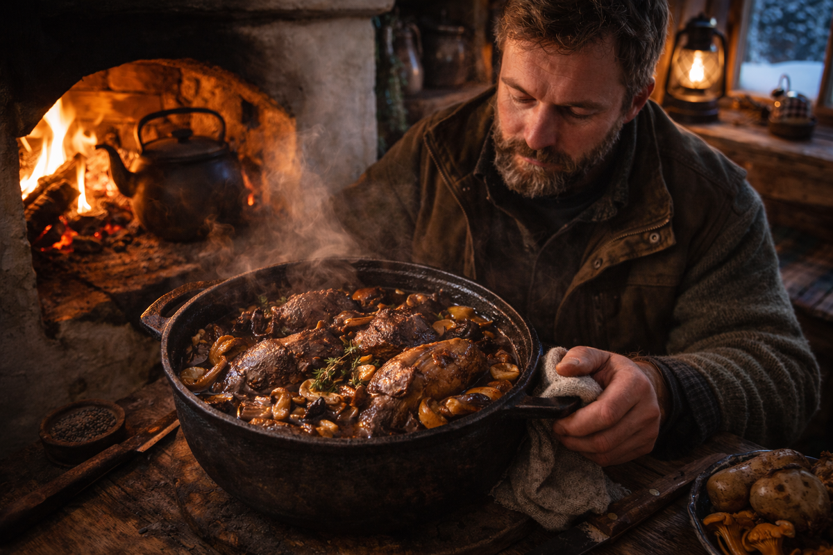 Охотник возвращается к зимовью уже ближе к вечеру, когда холодный воздух в тайге становится особенно прозрачным, а лес наполняется тихими звуками уходящего дня. Снег мягко поскрипывает под сапогами, над тёмными вершинами кедров медленно поднимается луна, и где-то далеко в распадке перекликаются кедровки. За плечами тяжёлый рюкзак, а внутри лежит крупная таёжная птица — глухарь, добытый сегодня утром на старом токовище. Глухарь — птица серьёзная, мясо у него плотное, ароматное, с характерным лесным вкусом, и если приготовить его правильно, получается один из самых вкусных ужинов, какие только можно сделать в тайге. В старых зимовьях такую птицу чаще всего готовят в печи — медленно, спокойно, с дымком и грибами, чтобы мясо пропиталось ароматами леса. Когда охотник заходит в избушку, первым делом он подбрасывает в печь несколько сухих поленьев лиственницы. Огонь разгорается быстро, печь начинает тихо потрескивать, и в избе постепенно становится тепло. На полке стоит старый чугунок и тяжёл