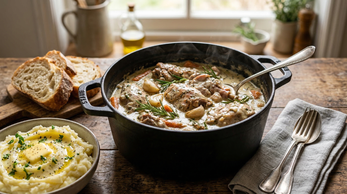 Кролик в сметане — это из тех блюд, которые не требуют ни ресторанного оборудования, ни экзотических ингредиентов, ни кулинарного образования. Нужны хорошие продукты, толстостенная кастрюля, два часа времени и немного терпения. Взамен вы получаете нечто фантастическое — мясо, тающее во рту, бархатный сметанный соус с ароматом розмарина и чеснока и восхищённые взгляды всех, кто сядет за стол. Попробуйте один раз — и этот рецепт навсегда пропишется в вашей кулинарной тетрадке. Как прописался в моей.