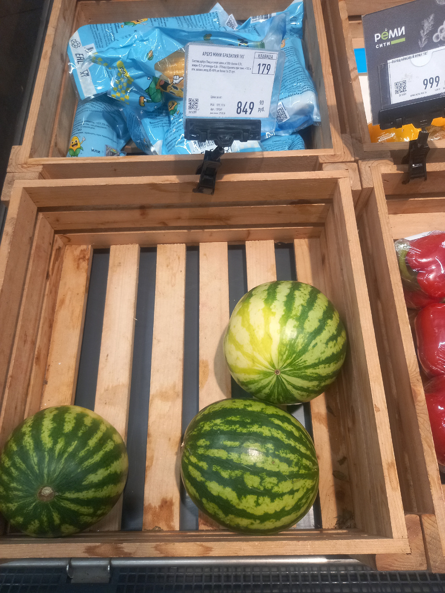 Как-то осенью, я уже показывала ассортимент дорогих овощей во вполне бюджетном ритейле. И, вот, накануне снова повлекло к полочкам для состоятельных господ. Скажу честно, как таковым ценам я не удивляюсь, в конце концов, в каждой квартире свои командиры. Но, вот мотивация граждан, эти продукты приобретающих, честно скажу - интересна. Возле ящика с бразильскими арбузами маялись раздумьями две юные леди. Больше всего, их занимал вопрос, будет ли арбуз также красив внутри, как и снаружи. Да, друзья мои, вкус арбуза их вовсе не занимал. И очень даже зря! Разумеется, для составления портрета типичного покупателя бразильских арбузов требуется репрезентативная выборка побольше, чем две юные девы, но с определенной долей уверенности могу сказать, желающих прибарахлиться арбузиком по 850 рублей за кило, не так чтобы и много. В очередь не стоят. А вы что думаете?