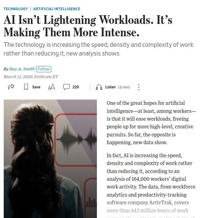 WSJ: AI не снижает нагрузку на работе - она становится ещё интенсивнее